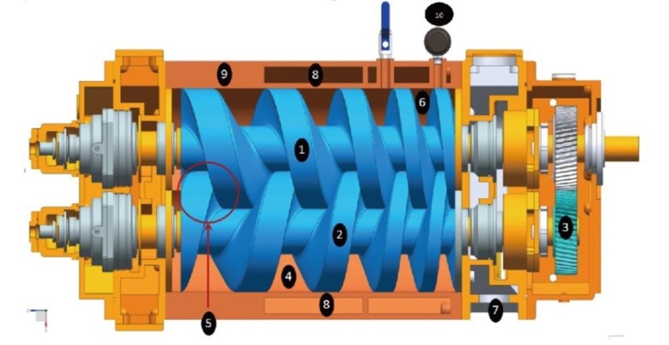 干式螺桿真空泵是利用一對相互嚙合的螺桿轉子,在泵殼間作同步高速反向旋轉而產生的吸氣和排氣作用的抽氣設備。兩個螺桿經過精細動平衡處理,由軸承支承,安裝在殼體中,螺桿與螺桿、螺桿與殼體之間有一定的間隙,相互之間無摩擦,運轉平穩,噪音低,工作腔無需工作介質。